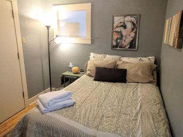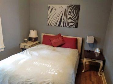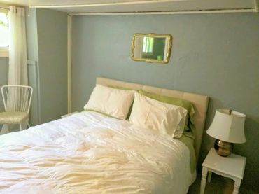 - Bedroom 3 is on the bottom floor has a makeshift closet outside of the room with clothing rack and shelves.